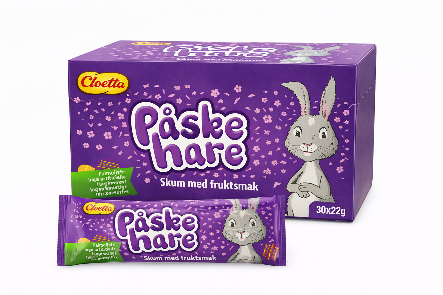 Cloetta Påskhare Skum med fruktsmak är ett klassiskt svenskt påskgodis med mjuk skumkonsistens och härlig fruktig smak. Perfekt för påskförsäljning i butik presentförpackningar eller som säsongsanpassat sortiment. Ett välkänt och uppskattat godis från Cloetta som skapar påskkänsla hos både stora och små.